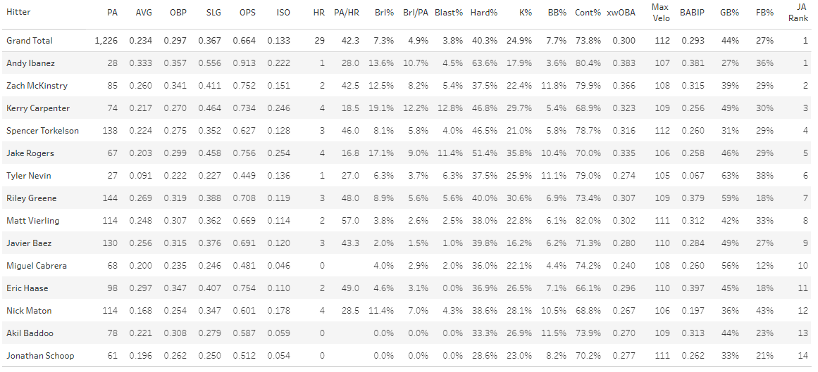 On the hitting side, Andy Ibanez has quietly gone for a .333/.357/.556 line in 28 PAs. He has a 13.6% Brl% and a 17.9% K%. He’s one of these guys that have turned the Tigers’ offense around in the last week or so. Zach McKinstry has also been good, here’s a look at that Tigers’ offense for the year: