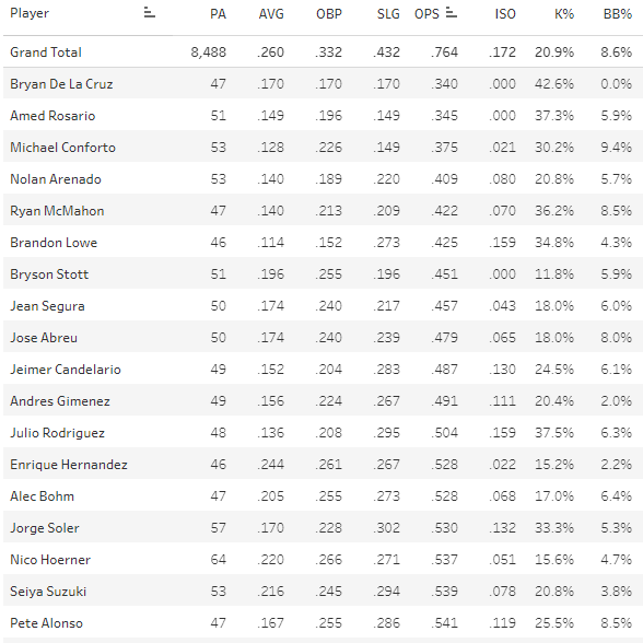 Yandy Diaz - 75 PA, 0.51 wOBA, 0.41 xwOBA, -0.1 Diff