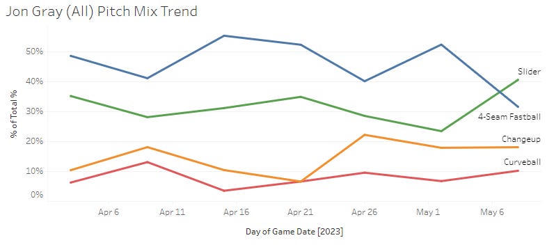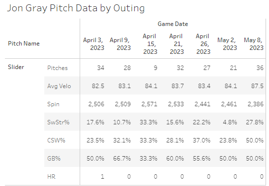 Jon Gray's SL velo (36 pitches) UP 4.1mph to 87.5