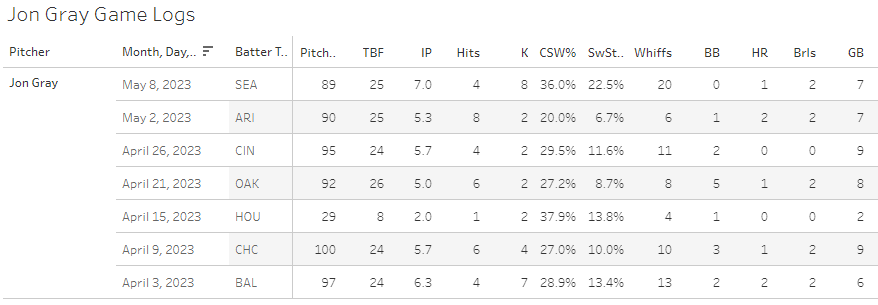 1. Jon Gray (TEX): 22.5 SwStr%, 36.0 CSW%