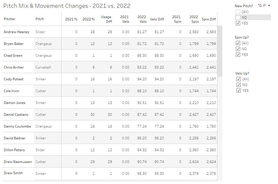 For paid subs, I’ve added a new sheet that tracks pitch mix changes for 2022 as compared to 2021. It finds all pitches that are either new this year, have significantly added velocity, or significantly added spin. It’s also a Tableau Dashboard that subs have access to. Here’s how it looks: