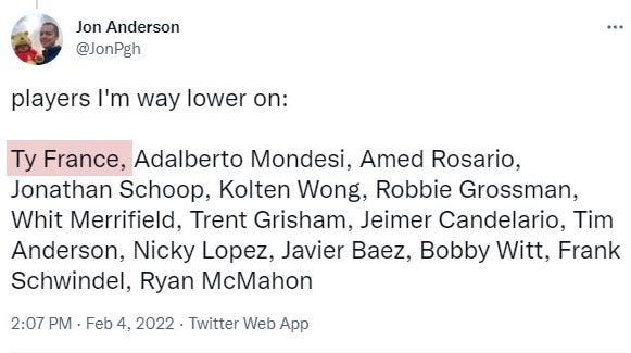 Usually, after my home league draft (a 15+ year league with my high school buddies), I go over the top making fun of everybody’s worst draft pick. This year I didn’t have a ton of time for that, so I really just zoned in on one guy. It was, of course, Ty France. Drafted by the league’s biggest punching bag, I really went to town on that pick, and I’m feeling the pain right now.