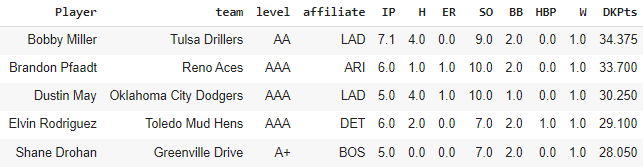 Bobby Miller drilled the opponents with nine punchies over 7.1 innings for the Dodgers’ AA. One level above was Dustin May on rehab, striking out 10 batters in five innings and walking one. If he’s available in your league, I’d add him right now - he’s tentatively scheduled to debut for the (Major League) Dodgers this week.