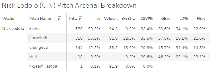 Another guy with a bright future is Nick Lodolo, who had another big CSW% rate of 34.6%. He has a crazy high 43% CSW% over his lat 100 batters faced. For the year that mark is 30.5%, pretty solid. His 13.4% SwStr% is also strong, but the 9.7% BB% is holding him back. It’s pretty interesting that he’s above 30% CSW% and above a 9% BB%. There aren’t a ton of pitchers in the league with a CSW% above 30% and a walker ate above 9%, typically as the CSW% goes up the walk rate goes down. Here’s the breakdown: