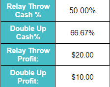 I put together and sent out a winner on DraftKings yesterday. I took 344th out of 17,429 in the Relay Throw (that’s in the top 2% of lineups there), but those tournaments are so top-heavy in the payouts that my payout was $50 on a $15 entry, so not even quadrupling up. We’ll take it, of course, and it brings us back into the black on this experiment we’re doing of tracking the results in the Relay Throw and a $5 Double-Up every day.