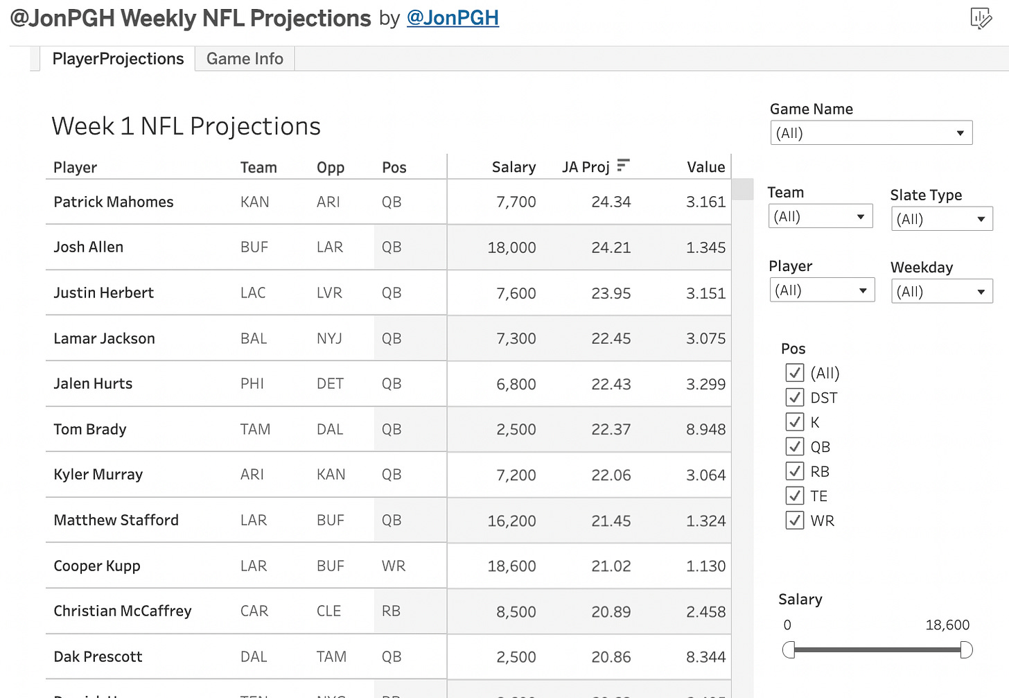 Daily Projections (with DraftKings salaries & scores) Excel & a Tableau Dashboard)