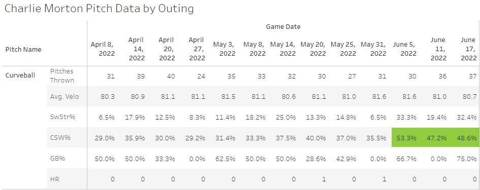 His curveball has been absolutely sick lately, posting CSW% rates of 53.3%, 47.2%, and 48.6% over his last three starts.
