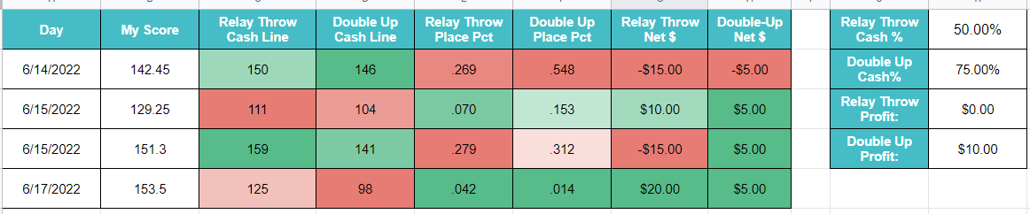 So far we’re 3/4 in cashing the double-ups and 2/4 in the Relay Throw, and we’re +$10.