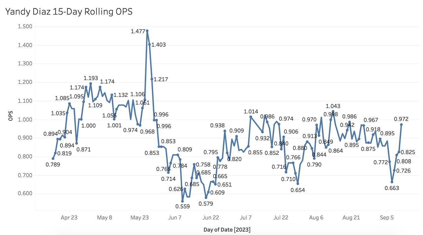 Yandy Diaz - 0.457 xwOBA, 18.4% Brl%, 79.1% Contact%, 20.8% Chase%, 14.8% K%