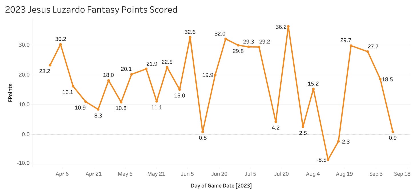 Jesus Luzardo got bombed again, this time by the Cardinals. He has bounced back and forth between very good starts (25+ points is a very good start, I would say) and very bad starts (below five points):