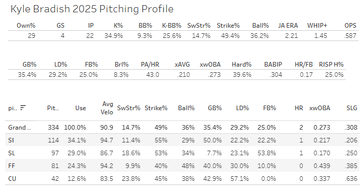 Kyle Bradish walked four like a real nincompoop. But while he was doing that, he struck out nine more hitters with 17 whiffs on a 19.3% SwStr%. He’s thrown 334 pitches now, here’s the profile: