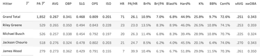 I will continue to bang the Riley Greene drum. His 90th-percentile exit velo on fly balls is 107.6 That is behind only these names: