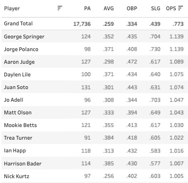 George Springer - 0.447 xwOBA, 22.5% Brl%, 77.2% Contact%, 22.1% Chase%, 21.7% K%