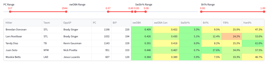 Mookie Betts - 0.444 xwOBA, 14.3% Brl%, 88.8% Contact%, 16.5% Chase%, 7.7% K%