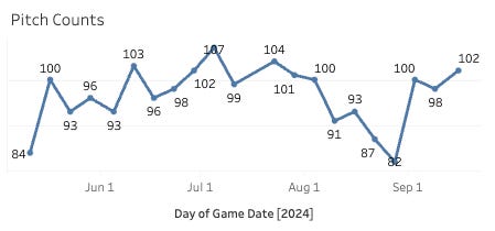 Paul Skenes threw 102 pitches. The Pirates were limiting him for a minute there, but these last three outings, he’s had full pitch counts. That doesn’t make a lot of sense, Pirates!
