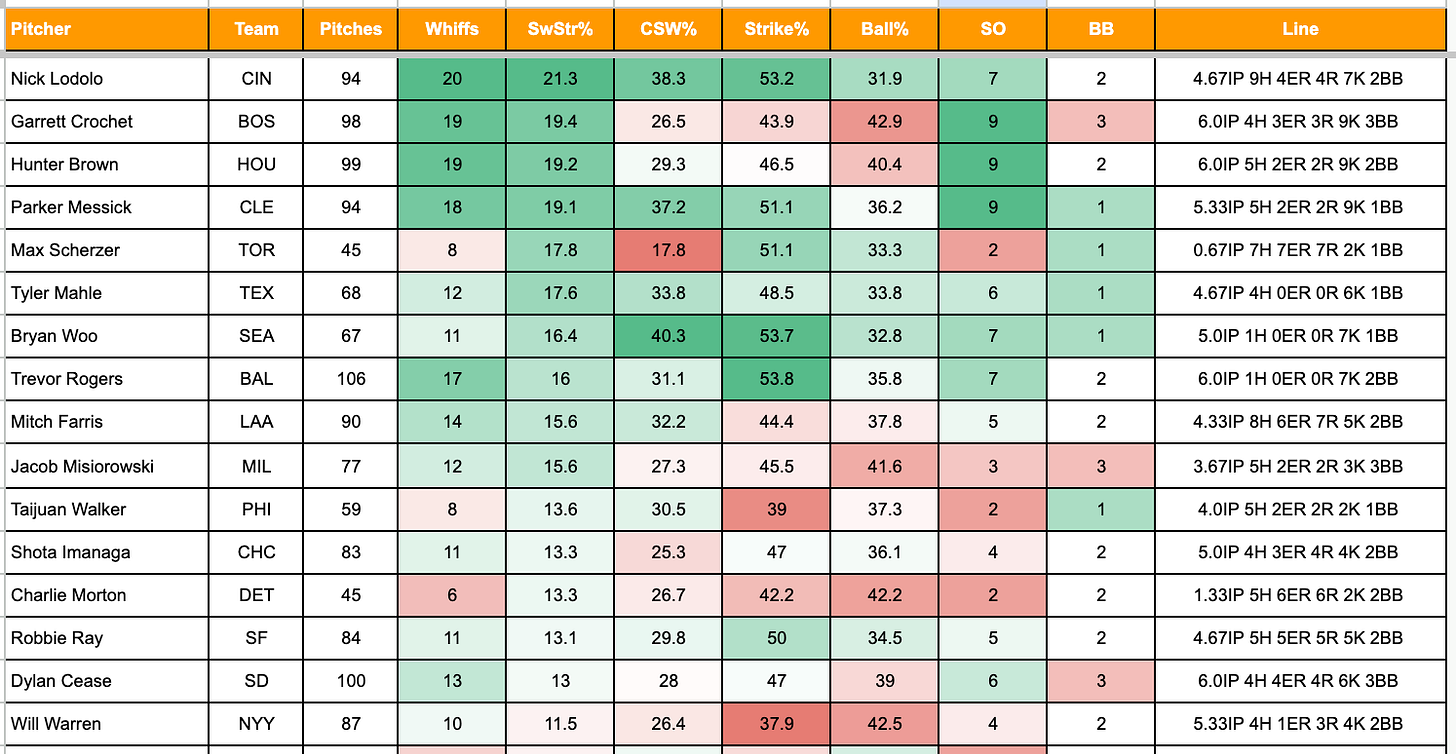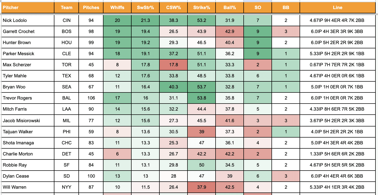 Nick Lodolo had a weird start. Four earned runs on nine hits, but 20 whiffs! Here are the top names from the Yesterday’s SP Data sheet.