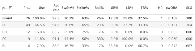 6 IP, 2 H, 1 ER, 12 K, 0 BB, 30.3% SwStr%, 63.2% Strike%