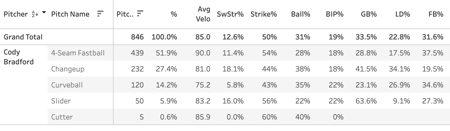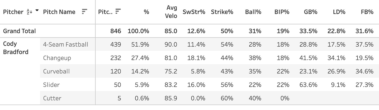 The changeup is good, but there’s no secondary pitch blowing anybody away - it wouldn’t seem. I think Bradford is a solid streaming option, but with more and more time, I think we’d see his stats get worse.