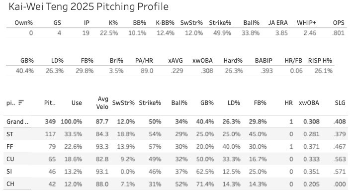 We begin with a look at Kai-Wei Teng. I don’t know why, but I keep coming back to this guy. He has been pretty awful in the Majors so far. He’s sporting a 7.23 ERA on a 1.71 WHIP with 22.5% K% and a 10.1% BB%. Nothing good there. But he did earn 17 whiffs in Coors last night with a big-time 20% SwStr% and an 8:0 K:BB. That’s some positive movement. Here’s the updated profile: