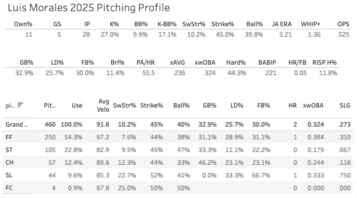 The 3.21 JA ERA is pretty good. You’re more or less looking for guys under 3.50 in that regard when you’re making decisions about who to own in fantasy. The issue with Morales is the fly ball. He’s given up a high 30% FB% and a really, really high 12% Brl%. That Brl% should come down a bit, but he will be giving up some homers. He was a good pickup for this two-start week, and I think you’re pretty happy with what he gave you yesterday.