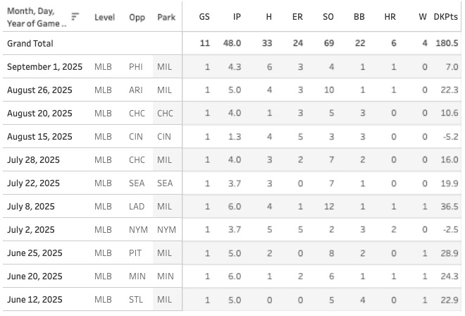 The fall of Jacob Misiorowski has been so wild to see. This guy made the all star team! He sports a 4.50 ERA with a 1.15 WHIP now. Still an elite 24% K-BB%.