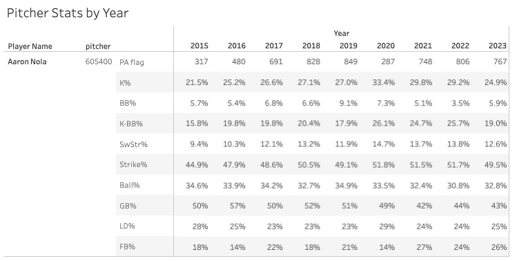 6. Aaron Nola (PHI): 55.3 Strike%, 27.7 Ball%
