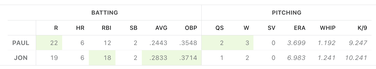Pretty much a tie right now. I have a decent hold on AVG/OBP and he has a strong hold on ERA/WHIP, while everything else is well within in the “coin flip” range. He for sure has better SPs to come than me, so QS/W are probably an uphill battle, but I have four extra hitters today so hopefully we can get a step up on R/HR/RBI/SB at some point.