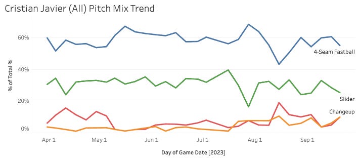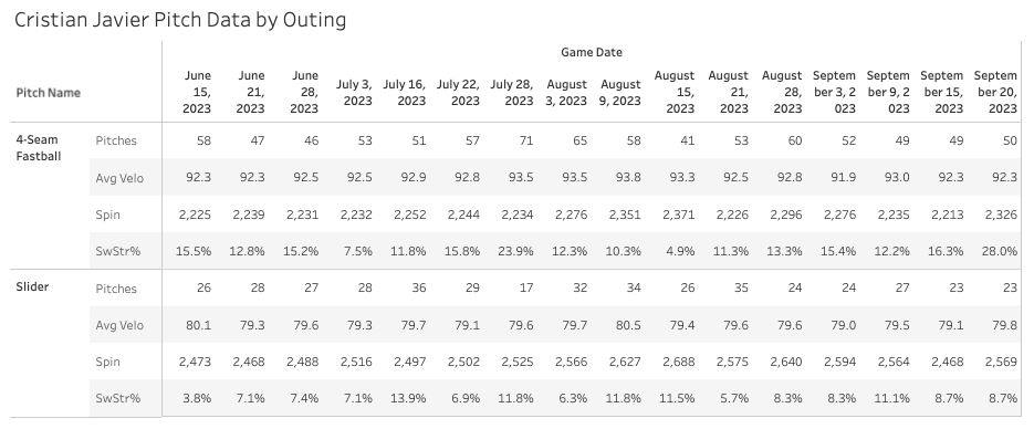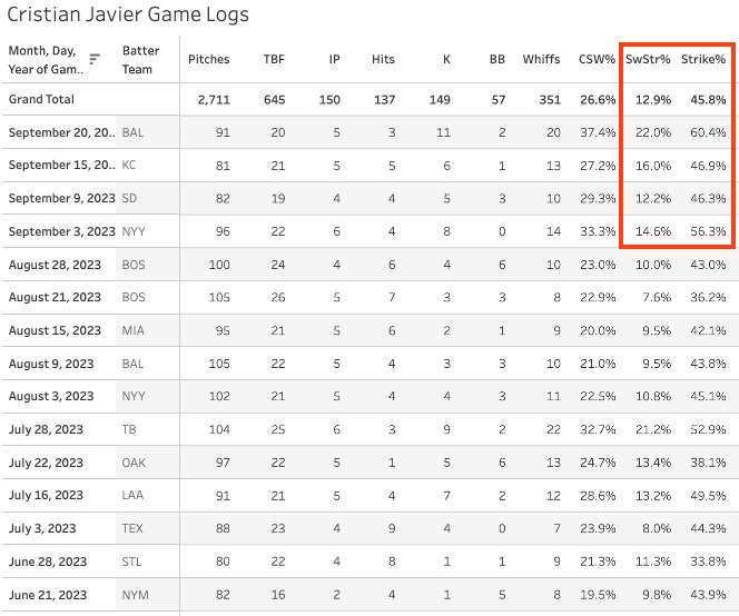 Are we about to get the Cristian Javier of last year again for the 2023 postseason? He had 20 whiffs yesterday with 11 strikeouts on a sick 60.4% Strike%.