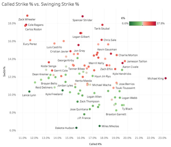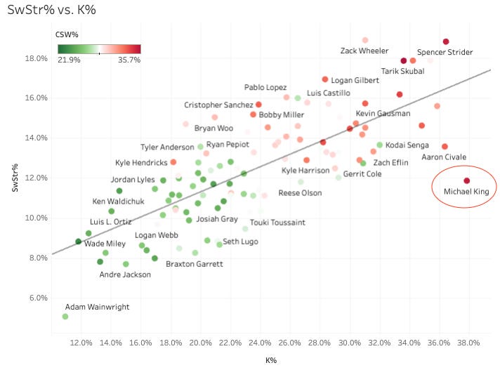 And there he is, leading the league in called strike by a mile. This is an insanely outlierish run for King. Not that it matters with 10 days left in the season, but King is 100% a sell right now - he’s wildly overperforming.