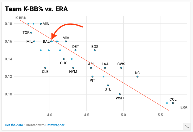 The Orioles seem to have had an extremely lucky year, particularly on the pitching side. I have a theory that if I plot K-BB% against ERA, they will be an outlier. I don’t know if this is true, so here I go to check it: