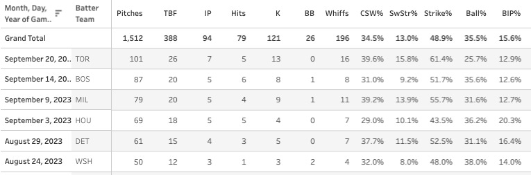 Since August 1st he has posted a 12.3% SwStr% and a 23.5% K%, although those numbers are still a long way from his marks in 2022. In these last four starts, he has a 16.3% SwStr% and a 36.6% K%, so that’s a lot more like it.