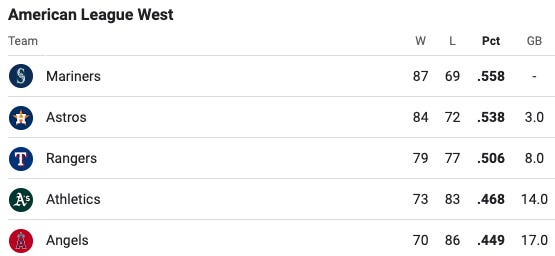 The Astros are also collapsing. The Mariners now have a three-game lead. And a three-game lead is tough to blow with just six games left to play.
