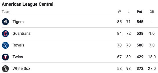 The Tigers now have a one-game lead over the Guardians! The Tigers are 1-9 in their last ten while the Guards are at 9-1. What a collapse. Cleveland and Milwaukee, man. Nobody wants to watch these teams, but they’re always winning divisions and making the playoffs. I’ve talked about this before. These are the teams I should like, but I don’t. I don’t know. I’ve just become a big market sellout or something.