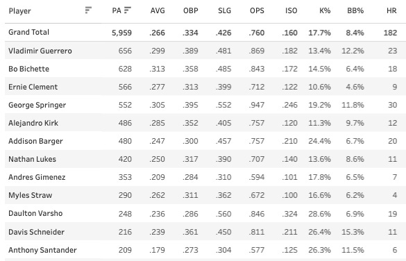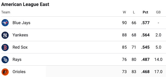 The Blue Jays hold a two-game lead over the Yankees. They have turned in a really nice offensive season, despite getting absolutely nothing from their big offseason acquisition Anthony Santander.