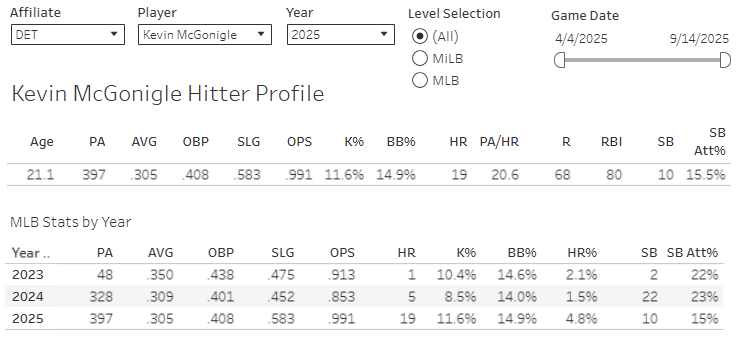 Kevin McGonigle is a Tigers’ prospect to know. The 21 year old now has a .991 OPS in the minor leagues in about 400 PAs.