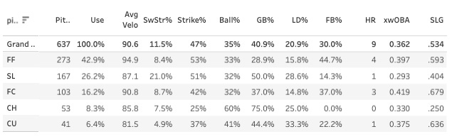 The fastball has been fine. The velo is fine, the SwStr% is a little low, but he has such good command of the pitch that he’s posted an elite 53% Strike% with it. Hitters have hit it a long way when they do get to it, though, as you can see with that .397 xwOBA and .593 SLG. Most of the damage has come fro lefties (.407 xwOBA by lefties vs. a .299 mark to righties). He would seem to need a better changeup. He’s thrown 44% fastballs and 21% sliders to lefties this year, and that doesn’t work if your stuff isn’t very good.