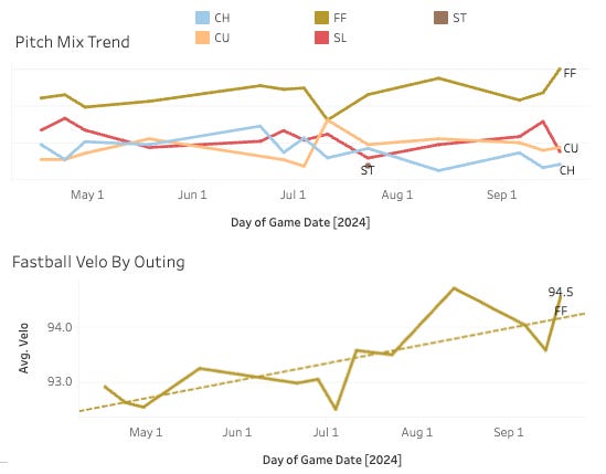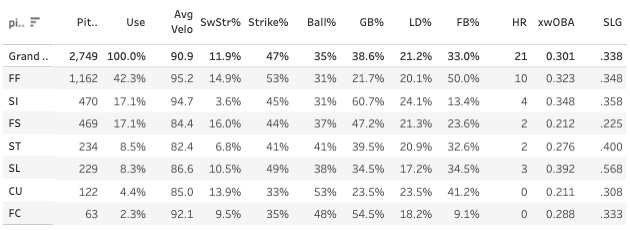 Miller might get one more start, although it wouldn’t be surprising to see them shut him down once they’re eliminated from contention. A positive year from Miller. He came in as a pretty different SP after relying very heavily on the four-seamer last season. He went throwing that fastball 59% of the time to that 42% usage you see above. The sinker and splitter usage came up to compensate (the splitter was new this year), and he kept mixing in the slider, sweeper, and changeup. He has a fantastic foundation with the four-seamer (an elite 15.4% SwStr% on that pitch this year), and a lot of other tools to experiment with. I think he’ll continue to improve.