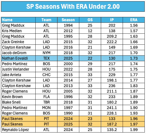 A 1.97 ERA on the year for Skenes. It’s hard to believe. He has a sub-two ERA in his two-year career now (62 starts). The K-BB% this year finished at 24%. He posted a 2.48 JA ERA. But the real magic of Skenes is the consistent soft contact he generates. He’s gone for a 1.42 WHIP+. WHIP+ is total bases allowed per inning (including walks and HBP).