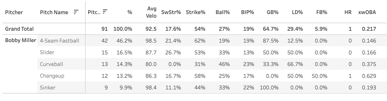 Bobby Miller - 103 TBF, 30.1 K%, 4.9 BB%, 46.2% GB%