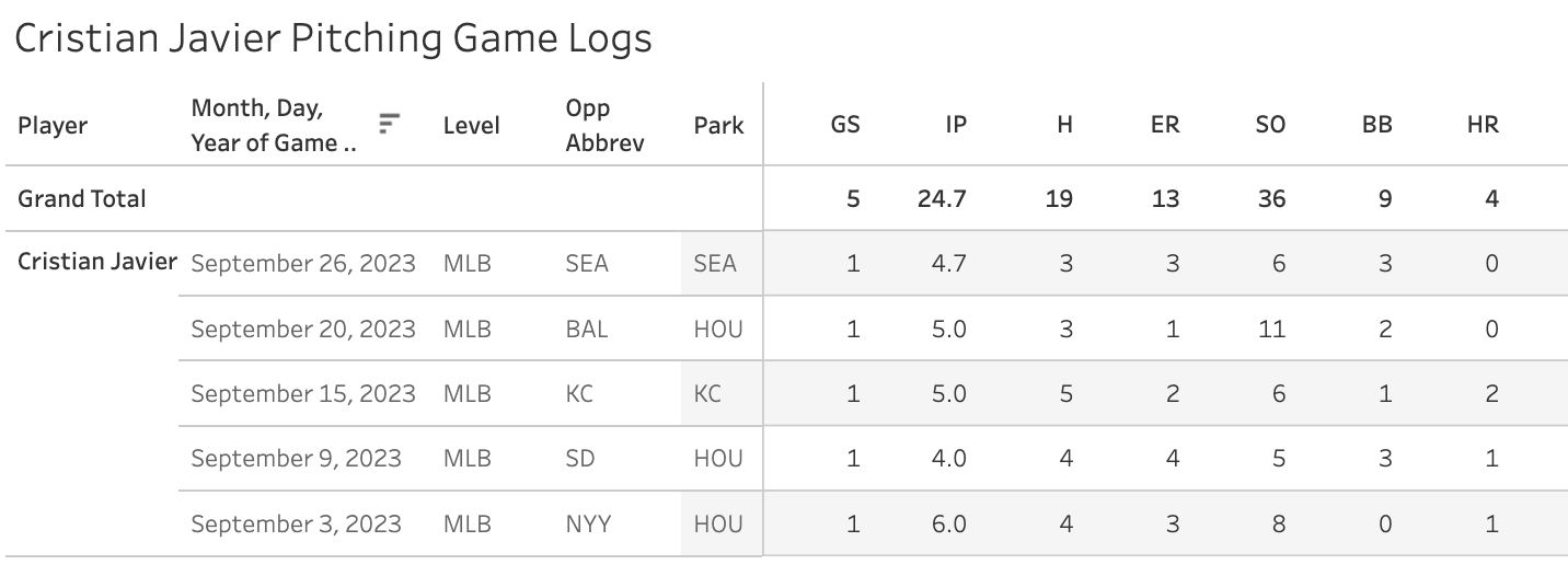 Pretty great result there with just the one hit, but you can see that the strikeout rate came way down and there was a big problem throwing strikes. His Strike% was bad at 39.8% and the Ball% was the third-highest on the night at 46.9%. Now, since September: