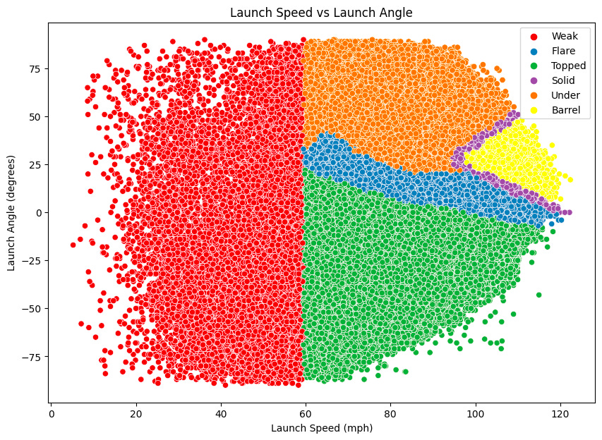 This is a scatter plot of batted balls since 2021 and how they are classified in the Baseball Savant launch_speed_angle classification model. This is the model that gives us barrels (the yellow dots there). Most people know about barrels, but fewer people know that there are five other categories that work the same way. This plot explains it all by itself, and it is a thing of beauty: