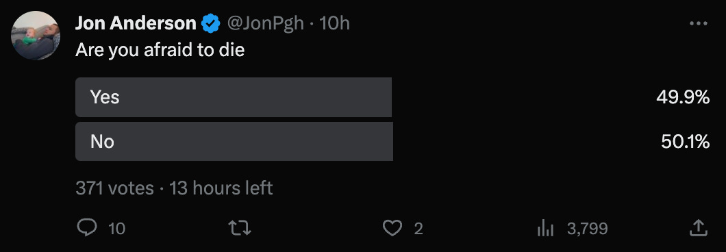 I just kind of doubt that 50% of people have a strong enough believe on either side to really beat the fear that comes from the idea. Personally, I’m in the first bullet point camp. I have been a Bible-believing Christian my whole life. The first reason for that was because it was how I was raised - but as an adult, I’ve really rediscovered it brand new and that has given me an actual, sturdy faith. So I believe that there is a heaven and that because of my faith and reliance on God that I will go there - but that doesn’t mean I would have definitely voted “No” on the poll. It’s a scary thought to imagine dying today and leaving behind my wife and three kids. A one-parent household is not a great situation for kids, so I really wouldn’t want that happening for my kids. But I guess the poll is more asking to ignore those kinds of externalities and just ask at the root - are you afraid of what might happen after death?