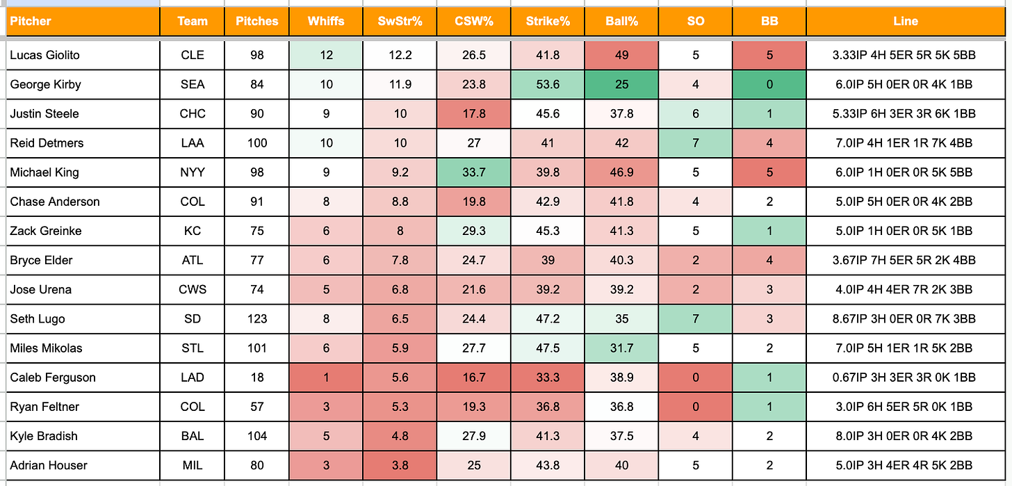 10. Lucas Giolito (CLE): 12 Whiffs (98 Pitches)