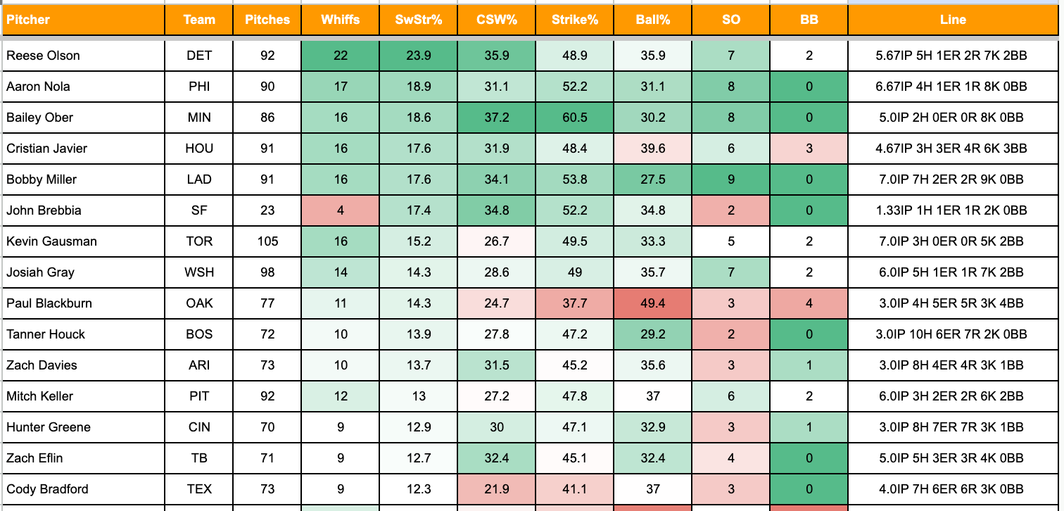 1. Reese Olson (DET): 22 Whiffs (92 Pitches)