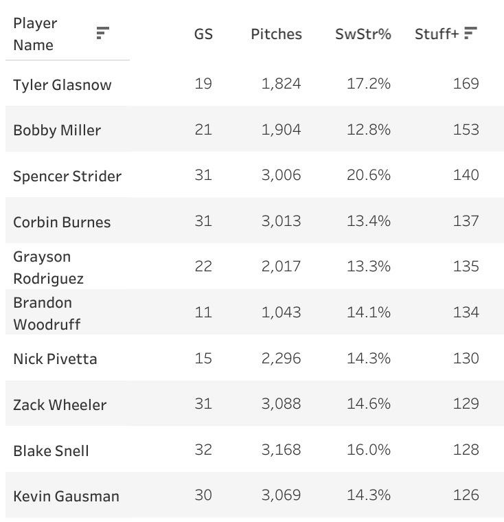 Only Tyler Glasnow has a higher Stuff+ than him (10 GS minimum)