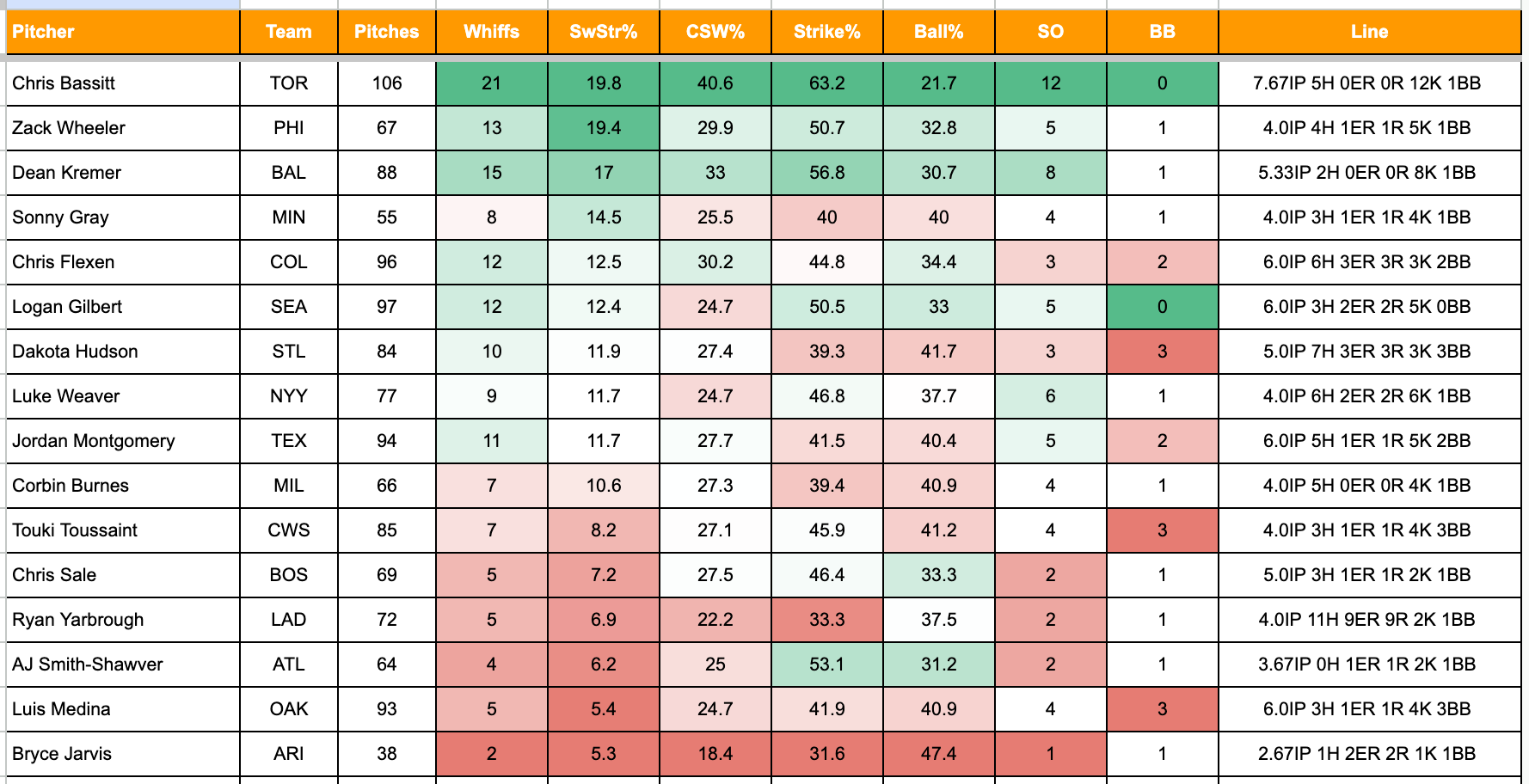 1. Chris Bassitt (TOR): 21 Whiffs (106 Pitches)