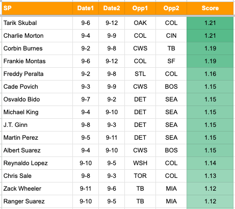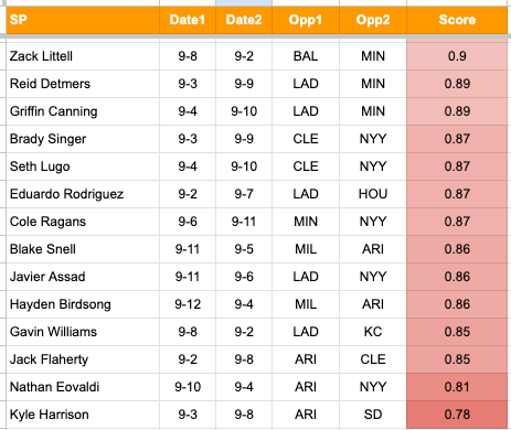 For large parts of this season, I have forgotten about this cool “SP Next 2 Starts SOS” resource I have. It looks at each pitcher’s next two probable opponents and grades them. Here are your softest upcoming SP schedules: