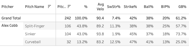 14. Alex Cobb (CLE): 46.2 Strike%, 36.2 Ball%
