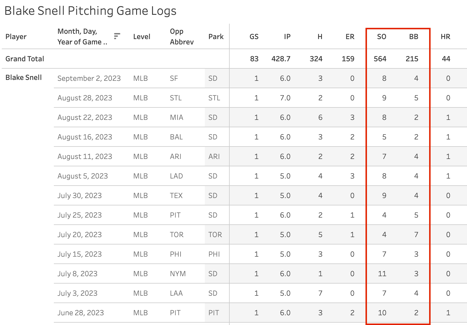 His 41.9% Ball% on the season is the highest in the league (SPs over 20 GS), but his 15.7% SwStr% is fifth-highest. His 12.8% BIP% (the percent of pitches thrown that get hit into play) is the best in the league, and only Spencer Strider is below 14% - so those two have a huge lead.