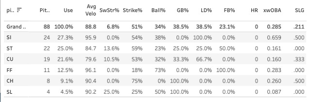 Zero whiffs on 24 sinkers. That’s not what you want to see if you’re hoping for a pitcher to get strikeouts. Also a 0% GB%, but probably just one or two balls in play there. The 54% Strike% was good The sweeper worked nicely at a 59% Strike%. And he has a pretty deep mix of options as well. So I don’t know, it could work for Sproat. It’s a heavy sinker. I’d expect him to be a groundball pitcher.
